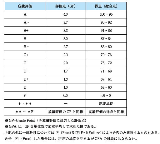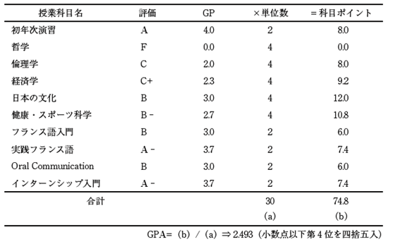 - 各成績評価に対してそれぞれポイントを定め、1単位あたりの成績の平均値を示すものです。
