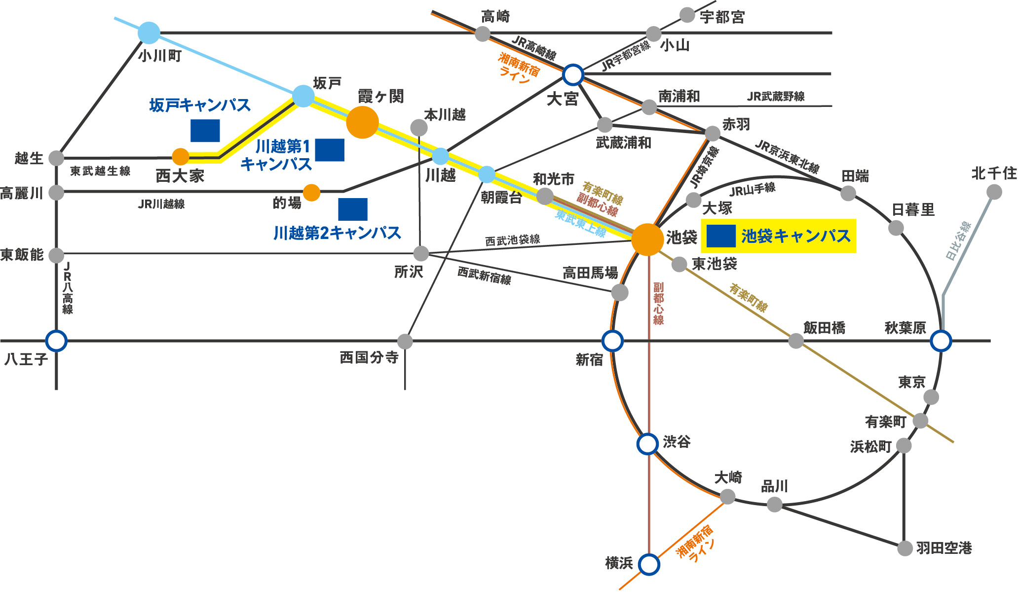 川越・坂戸キャンパスとは東京メトロ(有楽町線・副都心線)・東武東上線の一本でつながり、「池袋・川越・坂戸」の3拠点において、建学の精神である「公徳心を体した真の国際人の養成」を実践します。国内はもとより、広く国際社会からも評価される教育機関として、さらに飛躍していきます。