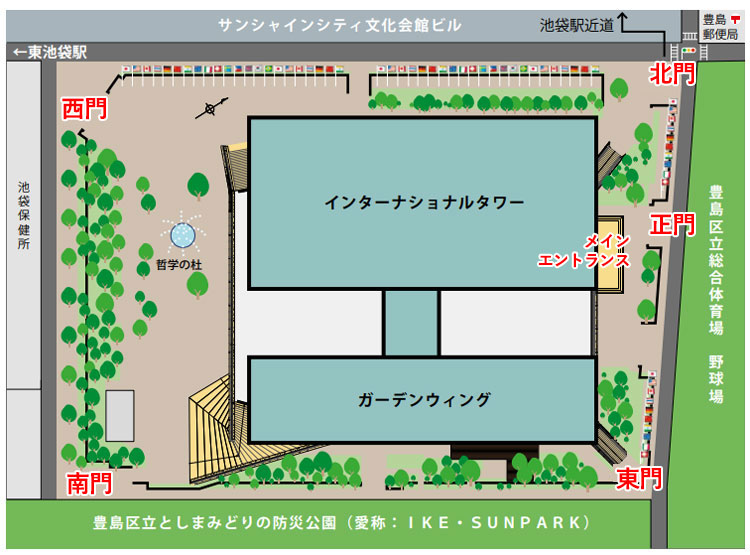 JR池袋駅よりお越しの場合、北門・西門が最寄りの入り口になります。