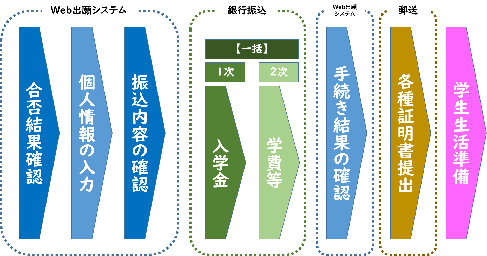 入学手続は「Web出願システム」での入学手続登録と「入学金・学費等」の納入が必要となります。